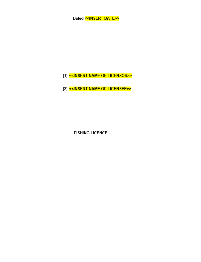 This Fishing Licence template grants a licence to a licensee from a landowner permitting the licensee to fish for a period of time (e.g. during a season) over a stretch of river, over a lake or pond.